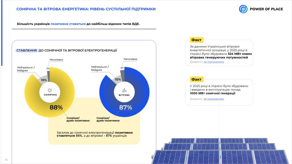 88% українців позитивно ставляться до вітрової та сонячної енергетики, а 64% вважають розвиток відновлюваних джерел найкращим рішенням для України. Про це свідчать дані дослідження суспільної думки, яке було проведено комунікаційною агенцією Power of Place за підтримки Європейської кліматичної фундації.
