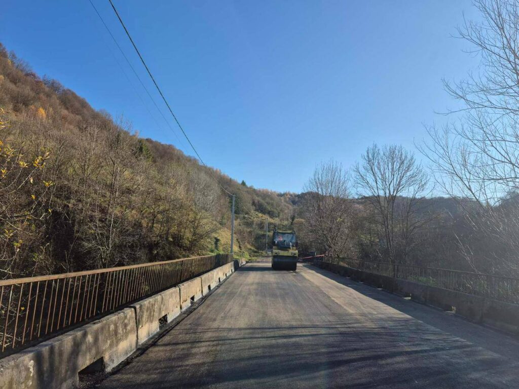 Підрядна організація Служби місцевих автомобільних доріг у Закарпатській області укладає новий шар асфальтобетонного покриття, ущільнює його катками й вирівнює основу.