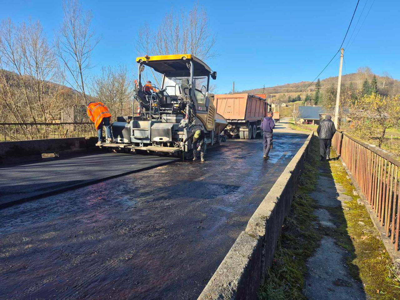 Підрядна організація Служби місцевих автомобільних доріг у Закарпатській області укладає новий шар асфальтобетонного покриття, ущільнює його катками й вирівнює основу.