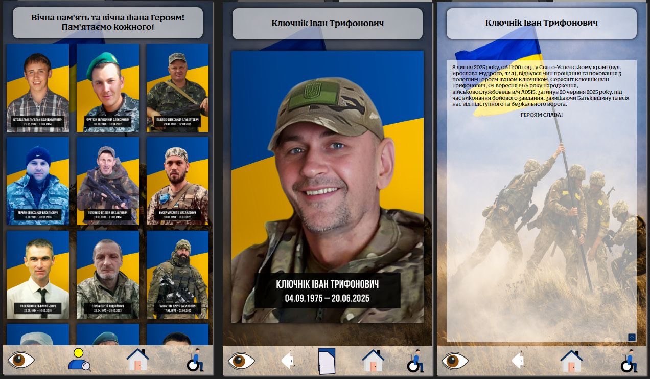 Цифрова база даних поділена на п’ять тематичних розділів. У «Галереї слави» містяться фото та детальна інформація про кожного полеглого Героя. «Бойовий шлях легенд» розповідає історії створення 128-ї окремої гірсько-штурмової бригади, 3-ї окремої штурмової бригади, 27-го прикордонного загону імені Героїв Карпатської Січі та 26-го окремого полку Національної гвардії України.