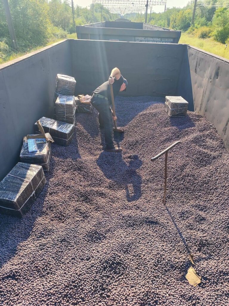 Під час огляду потяга, який перевозив котуни і жмих, правоохоронці помітили в одному з 59 вагонів ознаки стороннього втручання. Для поглибленої перевірки залучили оглядову групу, яка під насипом вантажу знайшла чорні пакунки. У них знаходилось 3963 пачки сигарет різних виробників.